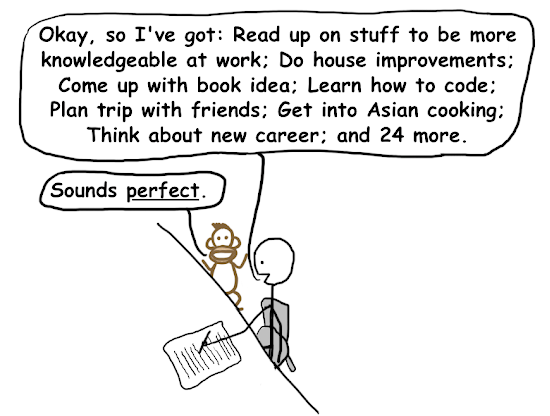 A big list of vague and daunting things makes the Instant Gratification Monkey( that lovely pet sitting next to me) laugh. When we make a list like that, the monkey says, “Oh perfect, this is easy.” Even if your conscious mind believes it intends to accomplish the items on that list in an efficient manner, the monkey knows that in your subconscious, you have no intention of doing so.