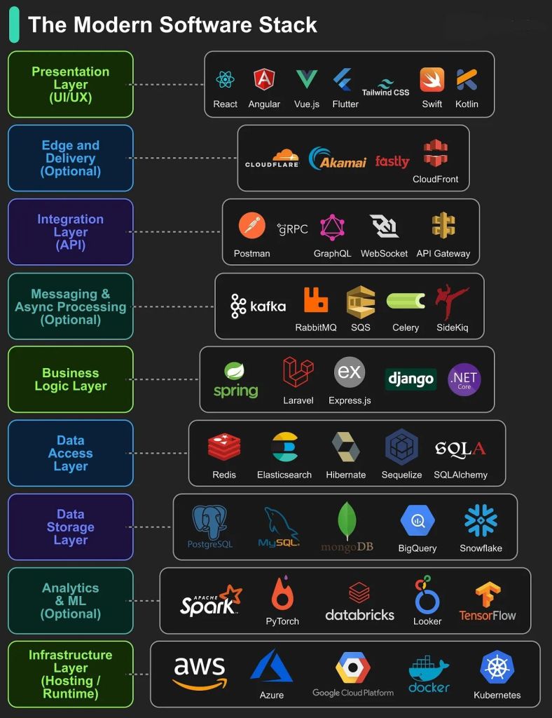 Here’s a breakdown of the 9 essential layers that form the blueprint for today’s most successful applications, from the screen you tap to the server farm running the show: